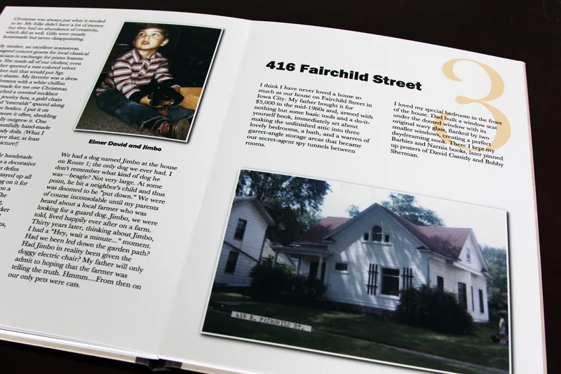 This little book, about 30 pages long, is short on story but long on photos. The text is mostly reminiscences; little vignettes of memory and mental snapshots from my childhood that I have tried to translate into words. There is no plot, just a collection of anecdotes, funny photo captions, and lists about my grade school years. Rather than getting out the big custom design guns (Adobe InDesign software, which is what we use to design our books), I went for a simpler template using a photo book tool.